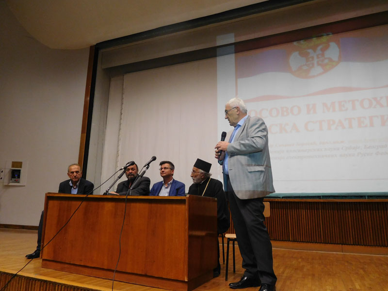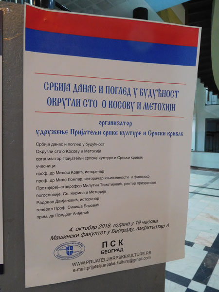 Округли сто о Косову и Метохији, у организацији удружења Пријатељи српске културе и удружења Српски кривак, одржан је 4. октобра 2018. у амфитеатру Машинског факултета у Београду, уз учешће др Милоша Ковића, професора на Катедри за историју Филозофског факултета у Београду, протојереја-ставрофора Милутина Тимотијевића, ректора призренске богословије Св. Кирила и Методија, историчара Радована Дамјановића и генерал-пуковника, доктора техничких наука Синише Боровића. Присуствовало је око 100 људи, међу којима и доста студената. Скуп је водио председник Секције ПСК за древну историју Срба и Словена, прим. др П. Анђелић. Он је поздравио учеснике и публику, а потом се захвалио домаћину скупа – Машинском факултету у Београду, на уступљеној сали и свакој врсти помоћи у организацији округлог стола. У уводној речи др Анђелић је напоменуо како удружење Пријатељи српске културе сматра да у овом тренутку нашег државног и националног живота треба проговорити о највећем проблему – питању Косова и Метохије. У наставку су говорили гости трибине, а резиме њихових излагања доносимо у кратким тезама. Фотографије које прате текст снимили су Милан Драгић и Бранка Косановић.