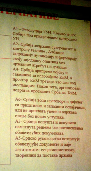 Генерал Синиша Боровић: Наш циљ није да задовољимо Шиптаре ни САД. Циљ су наши стратегијски интереси. Дужни смо да донесемо националну стратегију са разрађеним алтернативама. Према одређеним критеријумима и помоћу одговарајућег софтвера, тим стручњака је формулисао 6 алтернатива за разматрање решења проблема Косова и Метохије. Најбоља алтернатива јесте да Косово остане део Србије по Резолуцији 1244 Савета безбедности, под привременом контролом Уједињених нација. Најпогубнија алтернатива је потпис на уговор о независном Косову, односно признање Косова. Преговоре треба вршити у оквиру Савета безбедности. Представници Српске православне цркве треба да уђу у преговарачки процес. Постоји и право Србије на излаз на море, па и то питање треба покренути. Све док НАТО не оствари свој циљ, неће се зауставити. На фотографији, приложеној уз овај текст, налази се попис свих 6 алтернатива везаних за Косово и Метохију, од којих су за српску страну добре А1, А2 и А4, истакао је генерал Боровић.